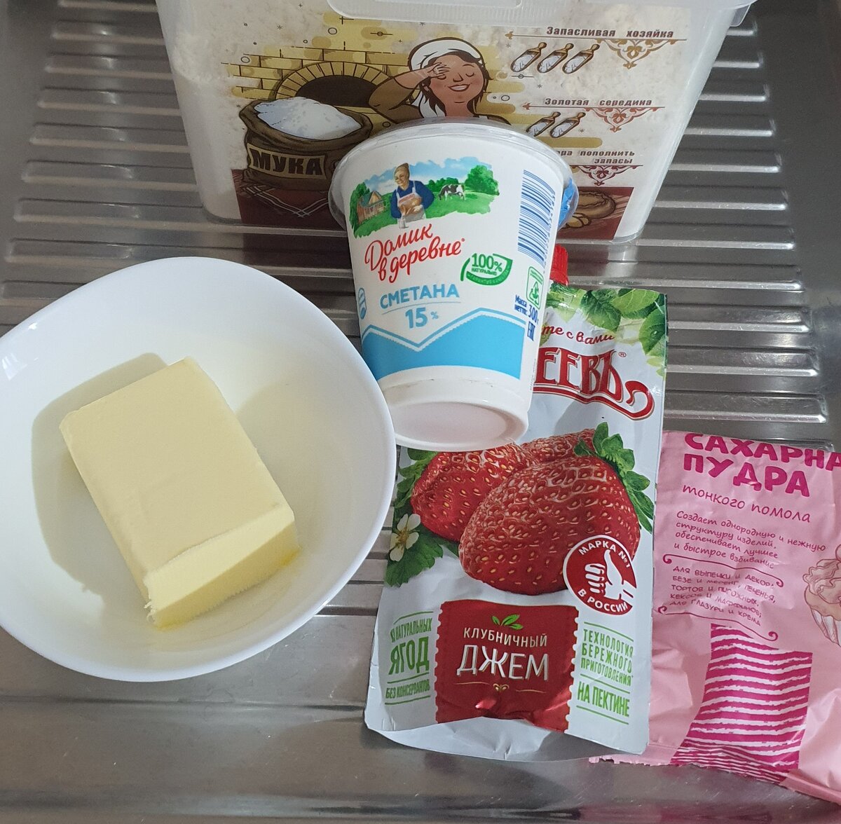 Это печенье готовится за считанные минуты, выглядит красиво и просто тает во рту. Ингредиенты простые, найдутся в каждом доме. Вам даже не понадобятся формочки! Ингредиенты: - сливочное масло или маргарин 150 грамм - сметана 150 грамм - мука пшеничная 2.5-3 стакана - джем и сахарная пудра по вкусу Масло или маргарин растопить до мягкого состояния любым удобным вам способом. В миске соединить масло и сметану. Тщательно перемешать. Добавить муку. Замесить мягкое тесто. Убрать тесто в пакет и положить в холодильник на 1 час. Разделить тесто на 2 части. Раскатать тонко, как на пельмени. Стараясь придерживаться круглой формы. Разрезать круг на 8-12 частей. У основания треугольника поместить начинку. Затем свернуть печенье в виде рулетика. Выпекать печенье при температуре 200 градусов 15-20 минут, до золотистого цвета. При необходимости смазать противень маслом или застелить пергаментом. Выложить готовое печенье на блюдо. Дать немного остыть и посыпать сахарной пудрой. П