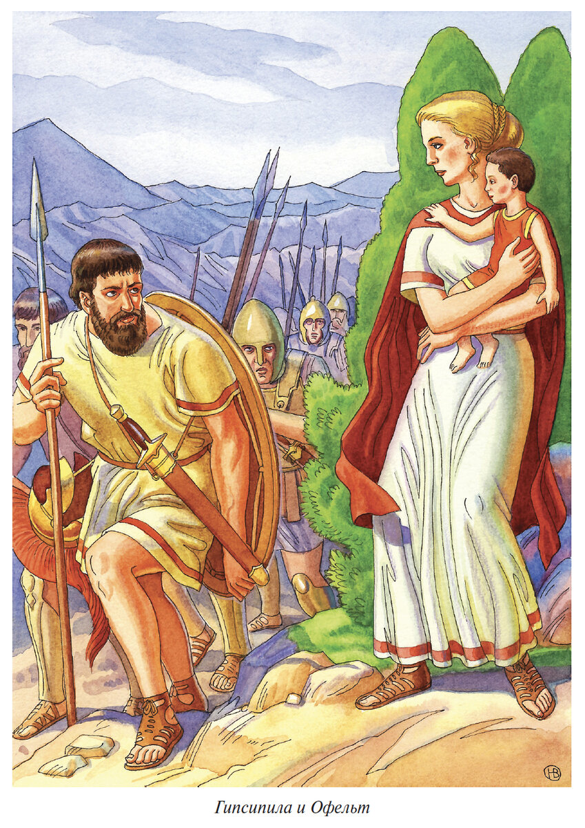 Это была Гипсипила, бывшая царица острова Лемнос, а ныне – рабыня царя Немеи Ликурга и нянька его маленького сына Офельта. История Гипсипилы была печальна, как и весь её облик. Несколько лет назад боги за какие-то грехи напустили безумие на лемносских женщин, и они расправились со всеми мужчинами на острове. Они перебили даже стариков и младенцев. Гипсипила в последний момент не нашла в себе сил убить своего отца Фоанта, хотя и была в сговоре с остальными женщинами Лемноса. Она спасла старика и помогла ему ночью тайно уплыть на рыбачьей лодке с острова. Когда её обман раскрылся, Гипсипилу свергли и продали в рабство.