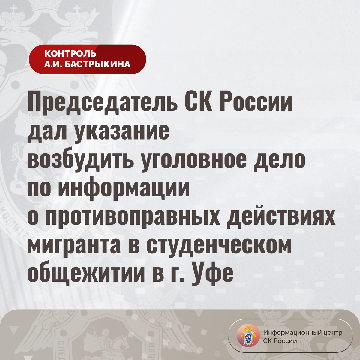Председатель СК России дал указание возбудить уголовное дело по информации о противоправных действиях мигранта в студенческом общежитии в г. Уфе