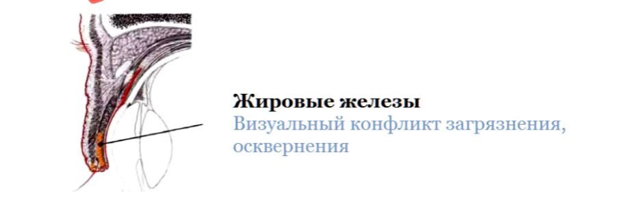 ЯЧМЕНЬ (HORDEOLUM) И ХАЛАЗИОН (CHALAZION) СБП ДЕРМЫ В верхнем и нижнем веке в основании ресниц находятся жировые железы, задача которых – смазывать край века. Жировая смазка предотвращает вытекание слезной жидкости за край века. Конфликт: Загрязнения или осквернения. Также данный диагноз говорит об оптическом загрязнении из-за увиденного. Таким образом, происходит нарушение целостности глаза. Как частный случай – возможная причина – это страх, что глаз высохнет. Важно уточнить, что в верхнем и нижнем веке основания ресниц расположены жировые железы, задача которых – смазывать край века. Жировая смазка предотвращает вытекание слезной жидкости за край века. ПРИМЕРЫ: На протяжении длительного времени ребенку приходится быть наблюдателем родительских ссор. Родители в грубой форме выясняют отношения друг другом, а у ребенка нет возможности уйти в другую комнату, чтобы не видеть конфликт. Таким образом, такой конфликт является оптическим загрязнением, возникает ячмень у пациента. Женщина