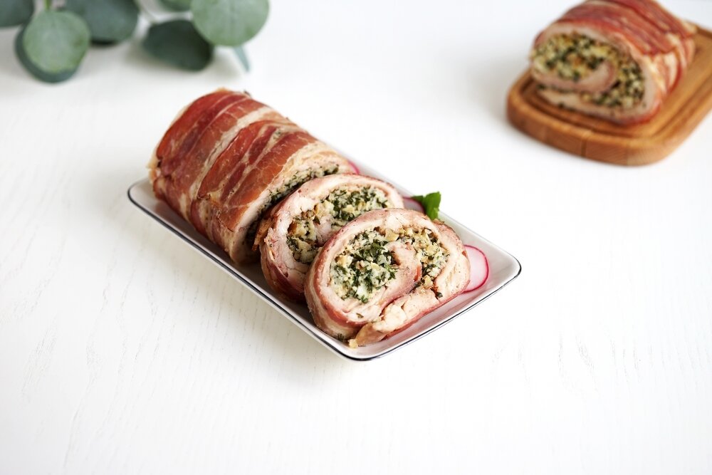 Этот куриный рулет получается очень сочным. Верхний слой из ломтиков ароматного бекона полностью исключает сухость мяса. В горячем виде куриный рулет очень нежный. В холодном становится более плотным, его легко тонко нарезать, и можно подавать в качестве закуски. Как приготовить нежный куриный рулет с сыром и орехами Ингредиенты: Приготовление: Шаг 1 Шаг 2 Приготовить начинку. Брынзу выложить в большую миску. Добавить к брынзе сметану. Всё хорошо взбить блендером до однородного состояния. Если у вас нет блендера, то протереть брынзу через сито или натереть на мелкой тёрке, а после смешать со сметаной. Шаг 3 Зелень петрушки и укропа хорошо промыть и обсушить. Мелко нарезать зелень без плотных стеблей. Добавить нарезанную зелень к сыру. Шаг 4 Грецкие орехи перебрать от возможной шелухи и скорлупы. При необходимости промыть и просушить. Нарезать орехи ножом и выложить к зелени и сыру. Начинку тщательно перемешать и убрать в сторону. Шаг 5 Подготовить лист фольги. Выложить его на плос