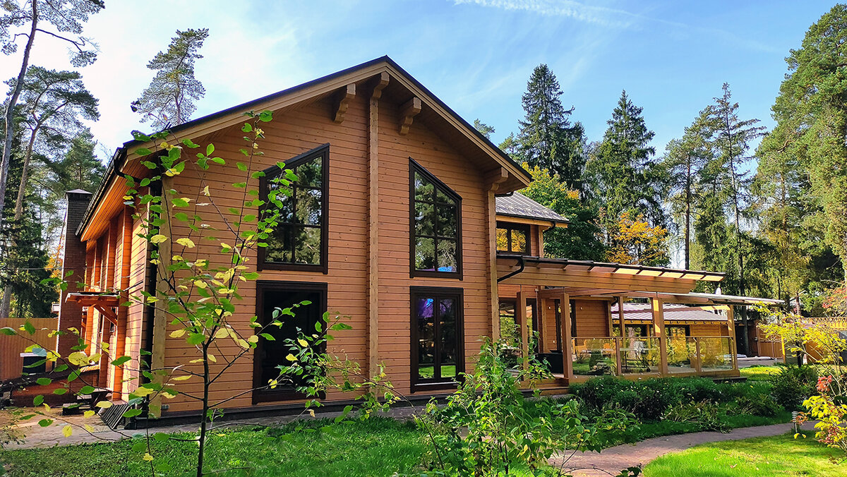 Для большой компании проектом предусмотрена большая гостиная с кухней площадью 67 м. Интерьер гостиной украшают вертикальные балки с укосами, несущие как эстетическую, так и силовую нагрузку. Расчет нагрузок позволил убрать столбы в зоне гостиной с пролетом 6,8 м, при условии применения таких балок.