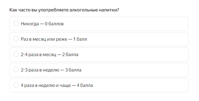 Тест AUDIT разработан специалистами ВОЗ в 1989 году. Позже он был переведен на 40 языков с учетом специфики употребления в разных странах. Я предлагаю вам пройти опросник, адаптированный под Россию. В нем всего 10 вопросов. Результаты теста — не диагноз, а ориентир. Но если тест показал, что у вас высокий риск зависимости, то рекомендую обратиться к психиатру или психиатру-психотерапевту / наркологу / клиническому психологу, работающему с зависимостями. Тест RUS-AUDIT (The Russian Alcohol Use Disorders Identification Test) активно применяется в медицинской сфере как вспомогательный элемент диагностики. Я хотела оформить тест через ЯндексФормы, чтобы можно было пройти его онлайн, но в процессе работы выяснилось, что специфика подсчета результатов в этом тесте не подходит для ЯФ, поэтому мне придется выложить опросник картинками, а вам — взять листочек, ручку и самостоятельно посчитать свои баллы. Листайте галерею 👇 Посчитайте общий балл и оцените свой результат. Обратите внимание, что