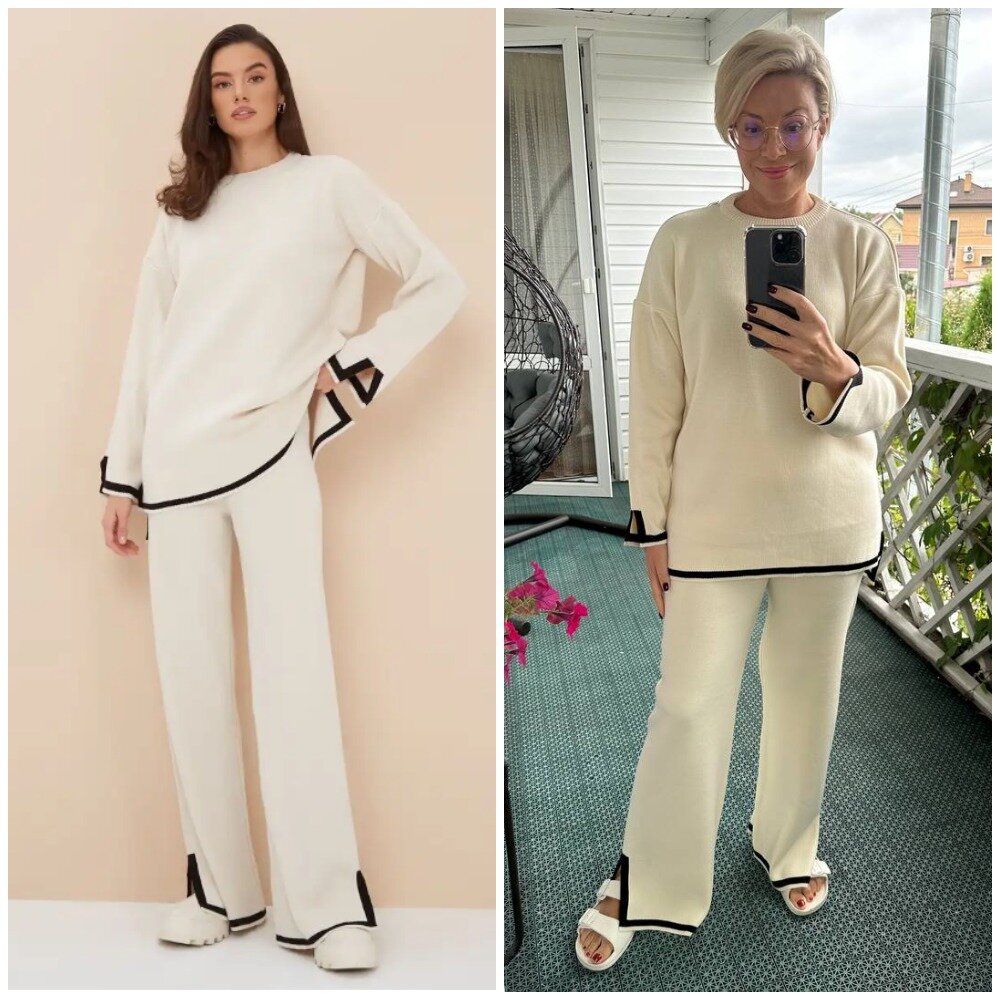 Здравствуйте, дорогие читатели! Меня зовут Ирина, я - стилист, и на этом канале показываю одежду и аксессуары с Wildberries такими, как они есть, то есть, из серии "ожидание/реальность". Мои параметры: рост 169 см, вес 62 кг, 94-74-100 ✅Основной канал: Стильно - не значит дорого! Ставьте лайк в поддержку канала, и давайте смотреть на мою сегодняшнюю покупку. Очень хороший повседневный костюм на холодное время года, невероятно уютный и теплый. У него единый размер (42-48), на мои параметры верх, как видите, сел свободно, а брюки облегают бедра, девушкам больше 50 размера я бы этот костюм советовать не стала. Джемпер удлиненный, прикрывает попу и отлично корректирует зону живота и бедер. И верх, и низ с разрезами и черными вставками, благодаря которым костюм проще миксовать с черными аксессуарами и обувью. Сам же костюм приятного молочного цвета. На мой взгляд, на осень и зиму вещь отличная. Если вам нужен артикул костюма, ставьте + в комментарии, всем отвечу. Ставим вердикт костюму: ДА