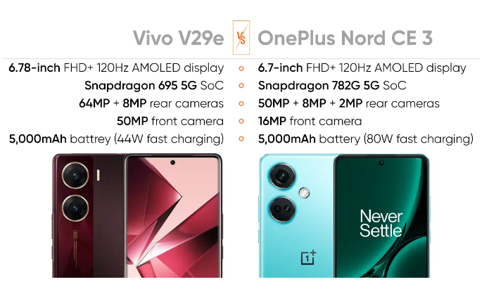 Vivo V29e поставляется с основной камерой на 64 МП и сверхширокоугольной камерой на 8 МП. OnePlus Nord CE 3 имеет основную камеру на 50 МП (с разнонаправленным PDAF), сверхширокоугольную на 8 МП и сенсор макросъёмки на 2 МП.