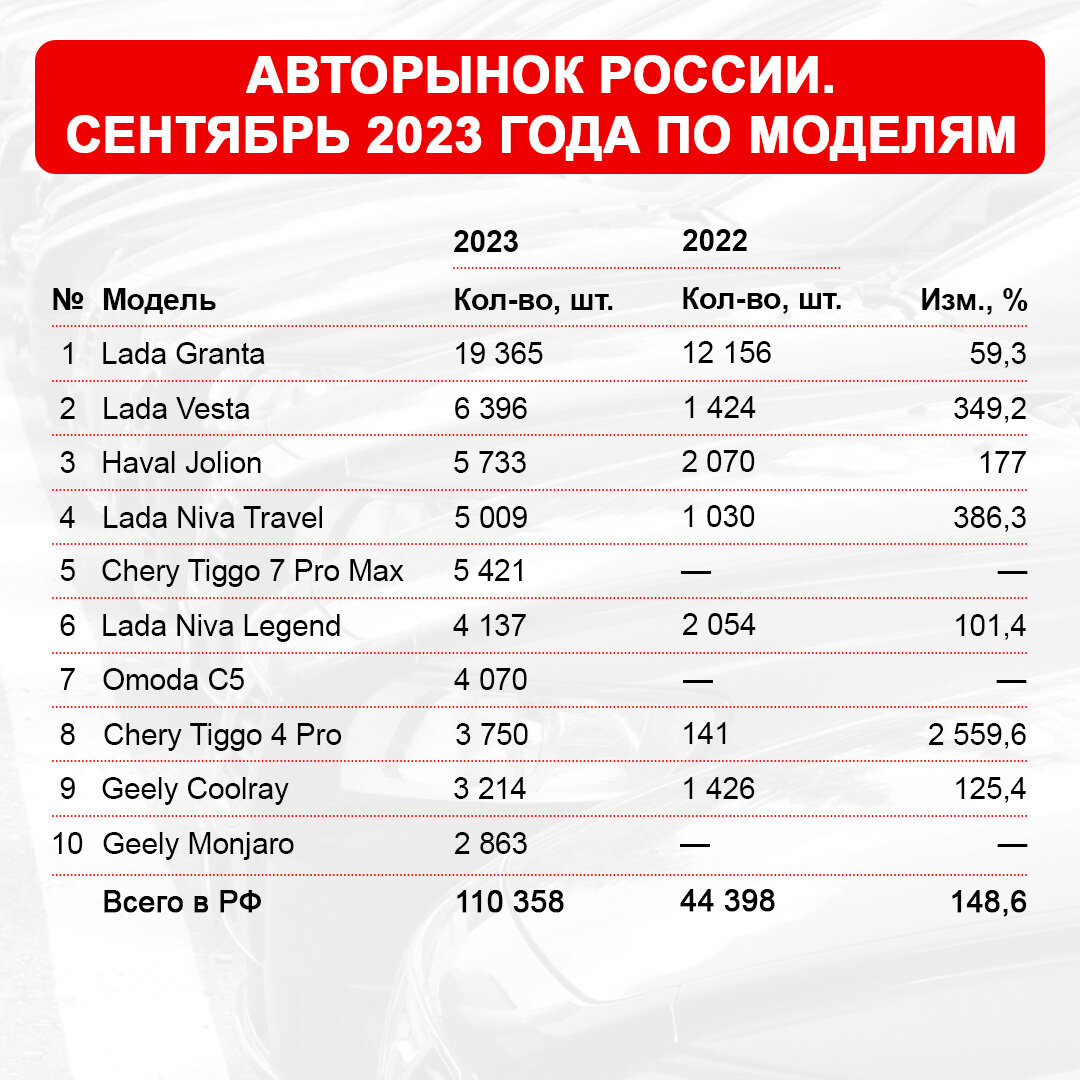 По итогам первого месяца осени в стране купили 110 358 новых легковых автомобилей — это на 148,6% больше, чем в сентябре 2022 года. Такой рост эксперты объясняется эффектом низкой базы — осенью 2022-го на рынке было мало продаж из-за санкционного давления.