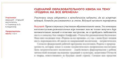 Эксперты журнала “Справочник старшего воспитателя дошкольного учреждения” (входит в Актион Образование) подготовили сценарий образовательного квиза для педагогов детского сада, чтобы поддержать их в начале работы по ФОП ДО. В начале работы по ФОП ДО у педагогов может быть много вопросов, которые ранее не было возможности обсудить. Или они возникли, потому что воспитатели перешли от теории к практике. Чтобы проработать эти пробелы в игровой форме, организуйте образовательный квиз. Тема квиза должна быть актуальной для всех участников. Для этого перед мероприятием проведите опрос и выясните, что интересует педагогов в данный момент. Игра включает несколько раундов. Чтобы не затягивать мероприятие, их количество должно быть не более 10. Классический квиз включает семь раундов. В каждом раунде – определенное число вопросов – обычно не более семи. Воспользуйтесь готовым сценарием мероприятия “Родина на все времена”. Таким способом вы продемонстрируете коллегам, как обыграть тему патриотичес