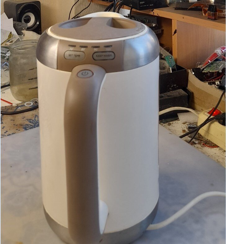 Всем здравствуйте! Сегодня у нас на ремонте электрочайник Philips HD4686 с диагнозом выключается раньше чем закипит или нагреет воду. Слова клиента. По факту так и есть. При включении он может нагреть воду до 70-80-90 градусов и выключиться. Закипятить воду не получается. Не осиливает. Температура выключения каждый раз разная. Вот это изобретение на фото. Будем разбирать посмотреть :) Правда фотки не все сделал. Объясню по ходу дела. Когда снимаем заливную крышку видны саморезы. Их выкручиваем и также с нижней стороны нужно выкрутить саморезы. Потом отщёлкнуть верхнюю панель ручки. А потом вся "требуха" вытаскивается вверх. Но нужно немного отогнуть защёлки возле окошка с указанием воды.И далее тянем-потянем :) Черный кожух прикручен на двух саморезах. Его снимаем и подлезаем к плате. А вот фото платы с другой стороны. Хм... с таким конструктивом он должен как минимум сам себе воду наливать и чай заказывать из магазина :)) Но ленится. Только поддерживает температуру. Пусть хозяева сам