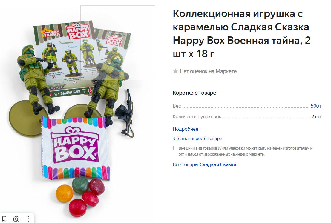 Народ, здравствуй. Искала подарки для внуков - столкнулась с этим шедевром. С английского Happy Box переводится как "счастливая коробочка". Ну, как-то не скрепно: вроде наши защитники с карамелькой для "сосания" положены в коробочку с названием на английском языке. А еще и какая-то "военная тайна" написано на ней. Конечно, любопытно было бы узнать эту военную тайну, но я решила, что лучше мы обойдемся без нее. А карамелек я и так смогу купить. Да, и описание сего чудного HAPPY BOX "Военная тайна" меня не вдохновило на его покупку. Пускай уж такие, как Симоньян, призвавшая вновь к ядерному хлопку, теперь над Сибирью, распознает со своими детьми, что за военная тайна скрыта в солдате и карамельке. Спасибо, и услышимся)))