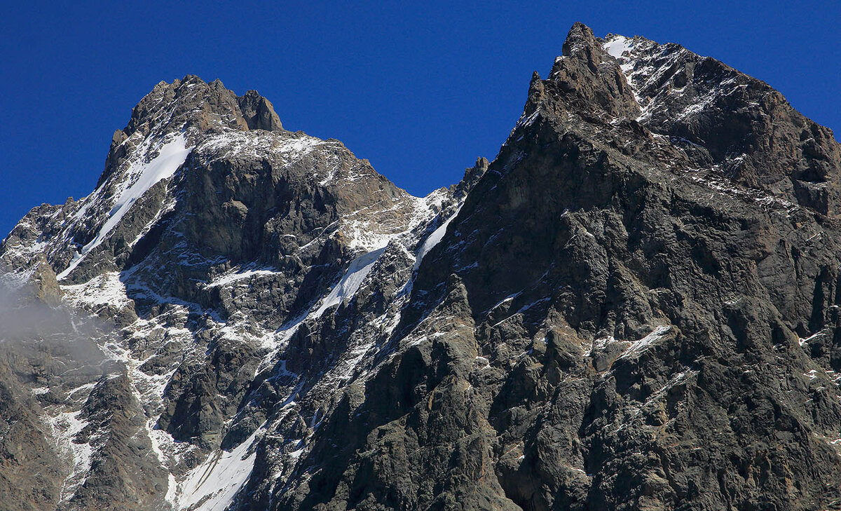 Утро настаивало на подвиг. "Подвиг" и был запланирован на этот день - планировался радиальный выход на Курсантские ночевки. Он включал в себя пересечение ледника с кучей мореных гребней и подъем к леднику, находящемуся между пиками Брно и Курсантов на высоту 3400 м. Со склонов Дых-Тау сошла небольшая лавинка. Отпустив ребят вверх по тропе к ночевкам, я ограничился высотой в 3200. Усевшись в ожидании оных на камушек на склоне. Вершины Северной стены были как на ладони - Уллу-Аух, пик Панорамный, пятитысячник Коштан-Тау, пик Тихонова и перевал Крумкольский провал. Правда, из общей картины выпадал кусок стены Мижирги - Дых-Тау с Миссес-Тау, но нельзя объять необъятное, т.е. все 15 км стены. Мероприятие было не сильно скучным. Ибо наплывающие облака несколько меняли вид на вершины. Соответственно я занялся фиксацией их поведения. Со склона открывался вид на ущелье Укю, в которое мы поднимались перед этим. Уллу-Ауз Коштан-Тау, пик Тихонова и перевал Крумкольский провал. Сверху просматривал