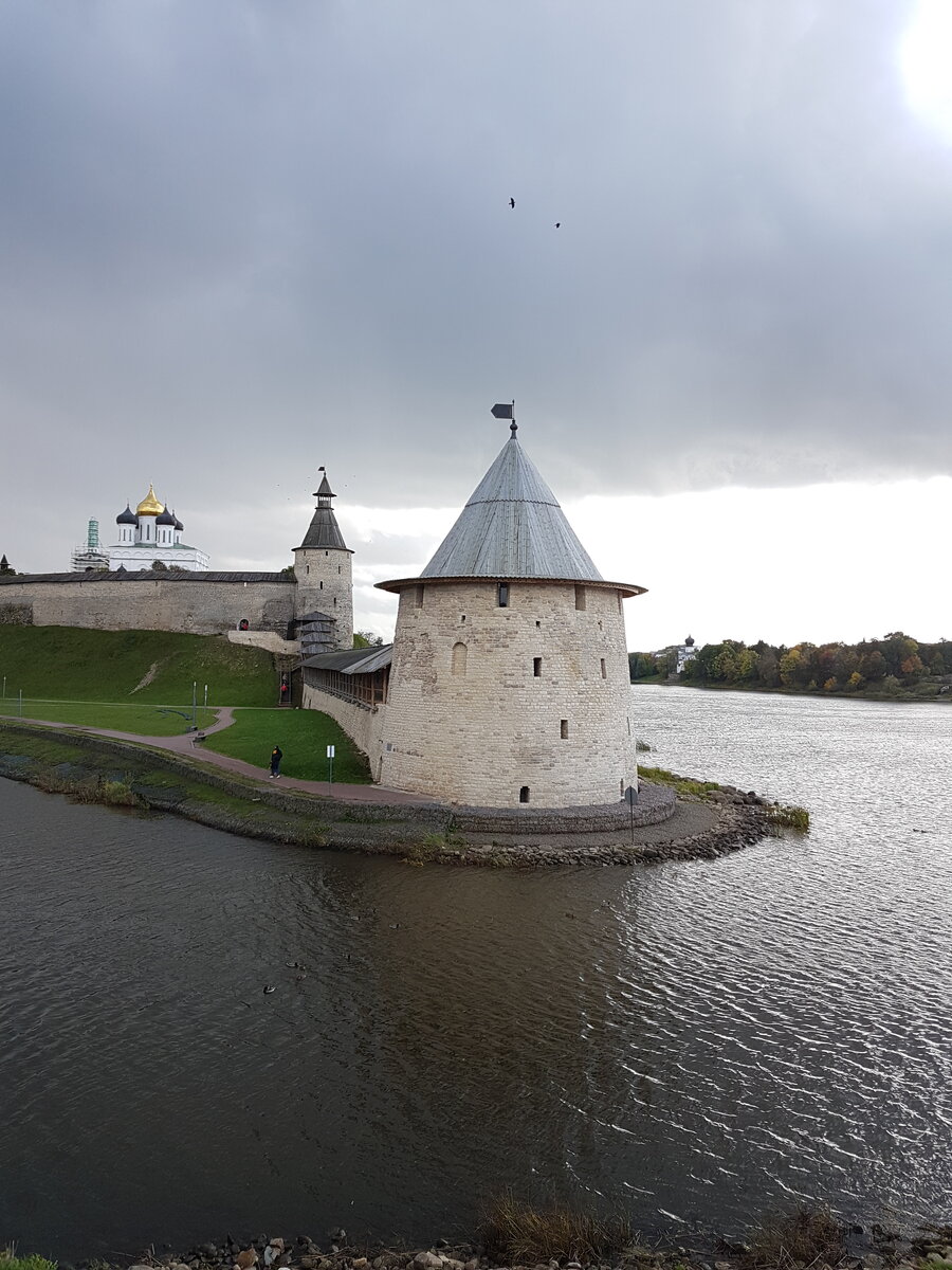 Сегодня чудна псковская погода: с утра моросило, мы ринулись в Псковский кремль. Но как только мы под крышу - дождь переставал, только выйдем на простор, польет дождь. Так что пришлось нам побывать во всех башнях кремля, открытых для просмотра. Правда, осмотр мы начали с Приказной палаты - что-то вроде мэрии при древнем Пскове - там считали казну, сажали в тюрьму, судили, рядили, даже давали разрешение на пытки. Потом мы пошли на Власьевскую башню. Все башни продуваются ветрами. Как назло сегодня был ну очень сильный ветер. На башне все так выло и трещало, что я испугалась, что нас снесет вместе с крышей, правда, обошлось, но вниз я спустилась с радостью, хоть и люблю всякую верхотуру. Кутекрому (какое милое название!) мы прошли насквозь к Плоской башне. Нужно сказать, что в Кроме крутых лестниц очень много, а перил, наоборот, мало. Так что качайте ноги и равновесие! Плоская башня порадовала ярким солнцем в бойницах и хорошими видами: Высокая башня, стена Окольного города, Валаамова б