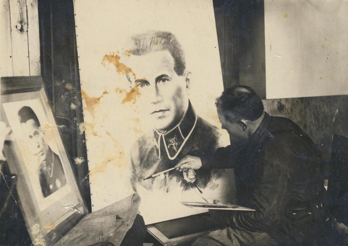 Художник рисует портрет Народного комиссара внутренних дел СССР ,Николая Ивановича Ежова. Надо заметить , ретуши портретов Сталина ,ой как далеко до ретуши портретов Ежова. Некрасивый ,почти карлик ,превращался ,на агитационных плакатах в писаного красавца , с выразительными глазами. Любимца публики. Здесь ,с его фото портрета ,рисуют большой портрет для уличной агитации. Фото ,не ранее 1937 г.