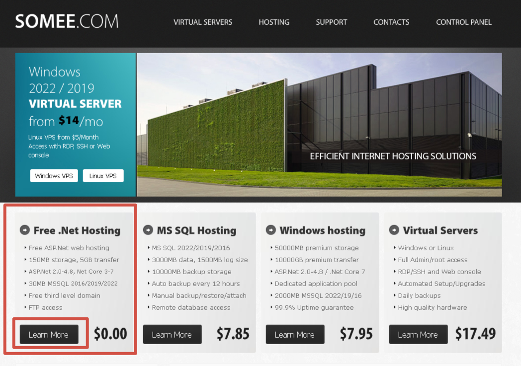 В этой статье я расскажу как опубликовать свой ASP.NET проект, это может быть ваш сайт или сервер, написать на .NET платформе. Переходим на https://somee.com/. Выберем Free .Net Hosting, через кнопку Learn More Читаем условия получения хостинга И нажимаем на Order Now Далее требуется зарегистрировать аккаунт на сервисе, выбираем REGISTER NEW ACCOUNT Заполняем данные и переходим дальше Далее переходим к подтверждению заказа через кнопку Checkout Вводим код из письма на почте Теперь осталось настроить наш сервер, назначаем имя сайта (или же сабдомен), он будет вместе с зоной составлять весь домен на примере alem.somee.com будет являться конечным доменом. назначаем операционную систему, если нет конкретных особенностей можно указать последнюю, под версию .NET по ситуации если у вас .NET Core или .NET Framework, есть оба варианта, установите нужный, далее название сайта и описание для панели управления, после можно нажать на кнопку создания Ваш сайт создан, ему выделили место на сервере,
