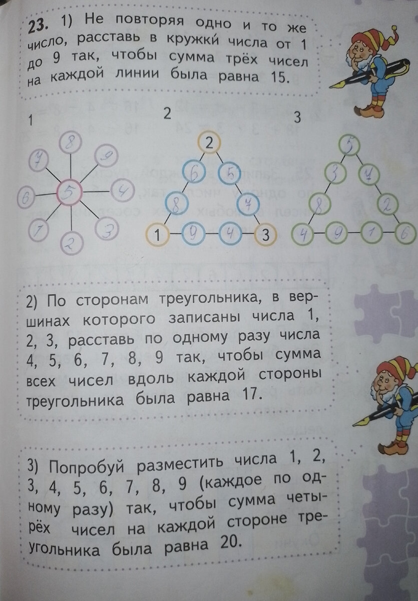 Не повторяя одно и то же число,расставь в кружки числа от 1 до 9 так,чтобы сумма трёх чисел на каждой линии была равна 15.