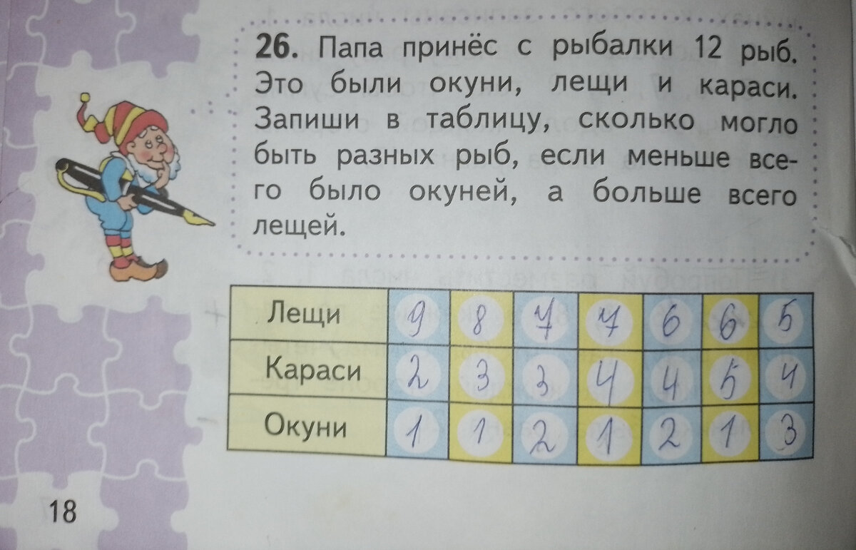 Папа принёс с рыбалки 12 рыб. Это были окуни,леди и караси.Запиши в таблицу, сколько могло быть разных рыб,если меньше всего было окуней...