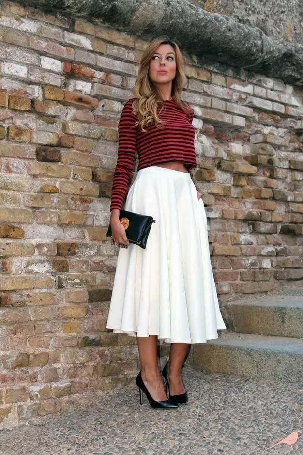 Одежда, длина которой спускается ниже колена, но не закрывает щиколотку, прямо создана для высоких каблуков. Здесь можно разгуляться! Шпильки, лодочки, мюли, босоножки на высоком каблуке — выбирайте, что вам больше по душе и по сезону. Такая юбка сочетается с любым каблуком! Но не отменяет плоскую подошву. С длиной миди отлично смотрятся лоферы, челси, оксфорды и другие бескаблучные модели. А если учесть,что это ещё и очень удобно, то правила и тренды быстро уходят на второй план.