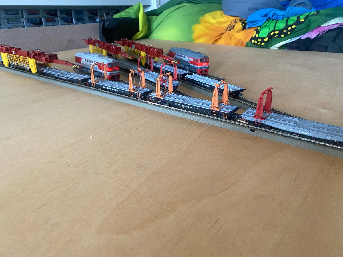 Моделист Денис Александрович на собственной странице соцсети ВКонтакте поделился интересными новостями на тему моделизма. Готовы первые заказанные путеукладочные машины УК-25/25, идущие в комплекте с платформами прикрытия и специализированными платформами типа УСО. Модели выполнены в масштабе 1:87 (типоразмер Н0). При изготовлении моделей использовалась резка полистирола на станке с ЧПУ с применением элементов, изготовленных путем 3д печати. Поручни и трапы изготовлены из травленой латуни производства мастерской "ArtModel". Надписи выполнены при помощи декалей производства Александра Никитина. Модель внешне выглядит практически как заводская, имеет ровную геометрию платформы и стрелы. Модель проходит радиус не менее R4, но катать ее проблематично при поворотах при наличии строений или деревьев, иных объектов рядом с путями, так как весьма получается большой вынос стрелы, длина которой составляет почти полметра. Канал "ПАНТОГРАФ". Использована информация и фото моделиста Дениса Алекса