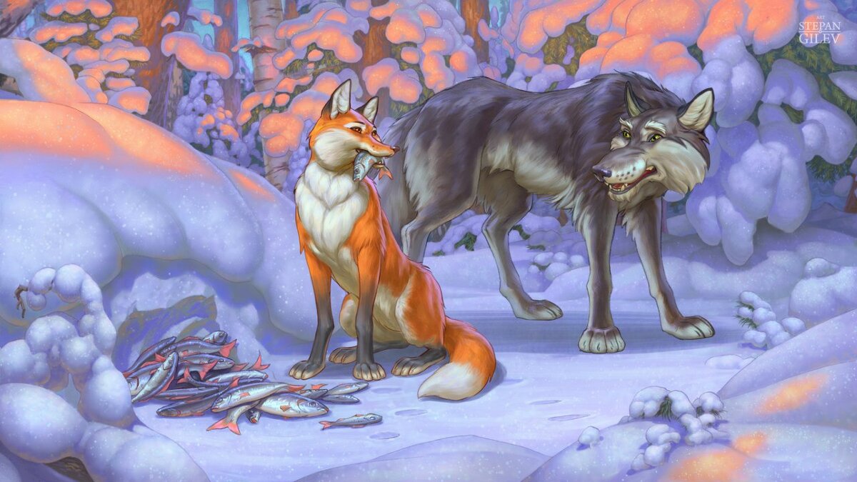 А лисичка собрала всю разбросанную по дороге рыбу в кучку, села и ест себе. Навстречу ей идет волк: «Здравствуй, кумушка!» — «Здравствуй, куманек!» — «Дай мне рыбки!» — «Налови сам, да и ешь». — «Я не умею». — «Эка, ведь я же наловила; ты, куманек, ступай на реку, опусти хвост в прорубь — рыба сама на хвост нацепляется, да смотри, сиди подольше, а то не наловишь».