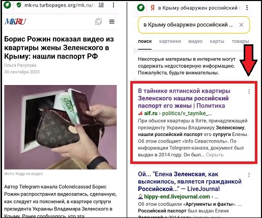 Недавно в российских сми появилась информация о том, что в Крыму на изъятой у Зеленских квартире был обнаружен тайник, в котором якобы хранился российский паспорт Елены Зеленской, жены президента Украины Владимира Зеленского. Сначала об этом сообщили крупные российские издательства, но многие потом удалили эту информацию. Обложка от сообщения в «Аргументах и Фактах» еще видна в поисковике, но сама статья не открывается. Так же в «Московском Комсомольце» можно найти публикацию от 30 сентября «Борис Рожин показал видео из квартиры жены Зеленского в Крыму: нашли паспорт РФ». И в итоге не совсем понятно, что это было, и как такое могло получиться. В прессе и в интернете показали изображение паспорта: Но в этом изображении было найдено противоречие. Первые две цифры серии — это код места выдачи паспорта, а вторые две цифры — это год выдачи. Серия паспорта 20 20 указывает на то, что он был выдан в 2020 году в Воронежской области. Но на этой же странице буквами написано, что паспорт выдан я