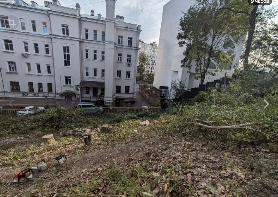 Сегодня жители дома на Светланской, 205 услышали звук бензопил, так как началась вырубка деревьев во дворе. Эта небольшая зеленая зона не была просто пустырём, она радовала глаз местных жителей, но, по-видимому, мешала коммерсантам. Участок 25:28:010025:1257 немного больше стандартных шести соток. Согласно выписке из ЕГРН, он был выделен в 2015 году и предназначен для парковки автомобилей.
