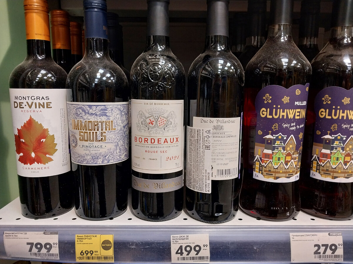 Я бы охарактеризовал ситуацию одним словом: безрадостно! А ведь ещё летом здесь были такие скидки, о которых мы все давно мечтали, например, красное сухое вино Бордо Duc De Villandrac я купил со скидкой 70%! Откройте в моём блоге обзор цен и акций от 21 июля, и вы увидите фото с ценником в разы меньше. Внимание на третью бутылку слева: