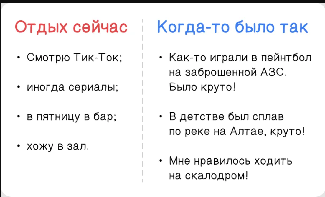 Важно помнить, что тут все индивидуально (что русскому хорошо, то немцу смерть). выпишите, что как вы сейчас отдыхаете и проводите свое свободное время. Затем выпишите эпизоды вашего отдыха за всю вашу жизнь, которые вас максимально наполнили энергией. Кто-то вспомнит как они с родителями ходили в поход, кто-то поездку на ферму вспомнит, кто-то коллекционировал в детстве марки и кайфовал от этого, и т.д.