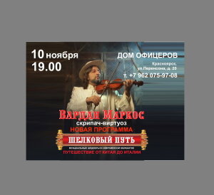 Вардан Маркос - скрипач-виртуоз, солист Кремль-концерта, лауреат международных конкурсов Вардан Маркос с новой программой «Шелковый путь» в Красноярске. Музыкальные шедевры в современной обработке! В программе вас ждет путешествие от Китая до Италии. Многие музыканты с классическим инструментом в руках сегодня оказываются перед большой проблемой: для кого они будут играть? Какая музыка необходима публике? Они ищут формы концертов, интересные сегодняшнему зрителю, и все чаще склоняются к синтезу искусств. В своих концертах-спектаклях скрипач Вардан Маркос, похоже, нашел актуальную форму и актуальную тему. Вардан Маркос — классический музыкант, который осуществил проект, доказавший, что классика может иметь серьезный коммерческий успех, будучи приближена по звучанию к современным музыкальным трендам.
