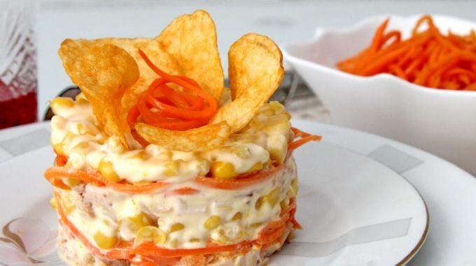 - Если чипсы хочется чем-то заменить, идеально – картофель отварной. Но этот слой следует укладывать между курицей и корейской морковью. Предварительно готовый картофель следует натереть на крупной терке.