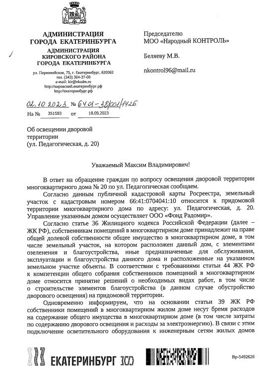 Ответ администрации Екатеринбурга по освещению дворовой территории