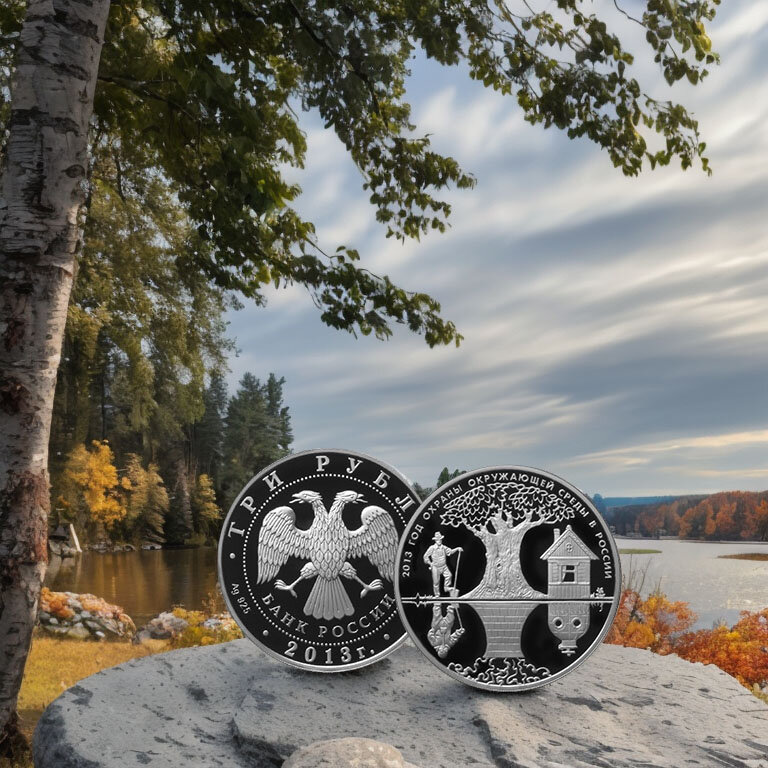 Российская монета "Год охраны окружающей среды" представляет собой серебряную монету номиналом 3 рубля. Ее общий вес составляет 31,10 грамма, а металл, из которого она изготовлена, – серебро пробы 925. Эта монета была выпущена в 2013 году Российской Федерацией в рамках серии "Отрасли промышленности России". На аверсе монеты изображена эмблема Банка России – двуглавый орел с опущенными крыльями. Под орлом расположена надпись "БАНК РОССИИ", а вверху указан номинал монеты – "ТРИ РУБЛЯ". В центре аверса указан год выпуска монеты – "2013 г.". Реверс монеты представляет собой изображение могучего дерева в верхней части диска. Слева от дерева изображен рабочий с лопатой, а справа – домик. В нижней части диска, в зеркальном отображении, показаны их образы, измененные в результате воздействия на окружающую среду. Здесь изображена охладительная башня электростанции, человек в защитном комбинезоне и противогазе, а также техническое сооружение. Вдоль канта монеты указана надпись: "2013 ГОД ОХРАНЫ