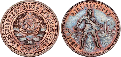 В 1925 году были отчеканены пробные экземпляры золотых червонцев, образца 1923 года. На аверсе находится крупное изображение герба Советского Союза, вокруг которого расположен коммунистический девиз: «ПРОЛЕТАРИИ ВСЕХ СТРАН, СОЕДИНЯЙТЕСЬ!». Под гербом выбита аббревиатура «С.С.С.Р.». На реверсе расположена символическая композиция, в центре которой выбита фигура сеятеля на фоне завода и плуга с восходящим солнцем. Над фигурой находится указание номинала «ОДИН ЧЕРВОНЕЦ». Слева от сеятеля на 19 часов выбито обозначение года чеканки «1925». Контур монеты украшен выпуклыми точками. Стоимость технического пробника этой монеты, сделанного в меди (на Ленинградском монетном дворе), на аукционе достигла 5 млн. руб. На данный момент этот медный пробник известен в единственном экземпляре.