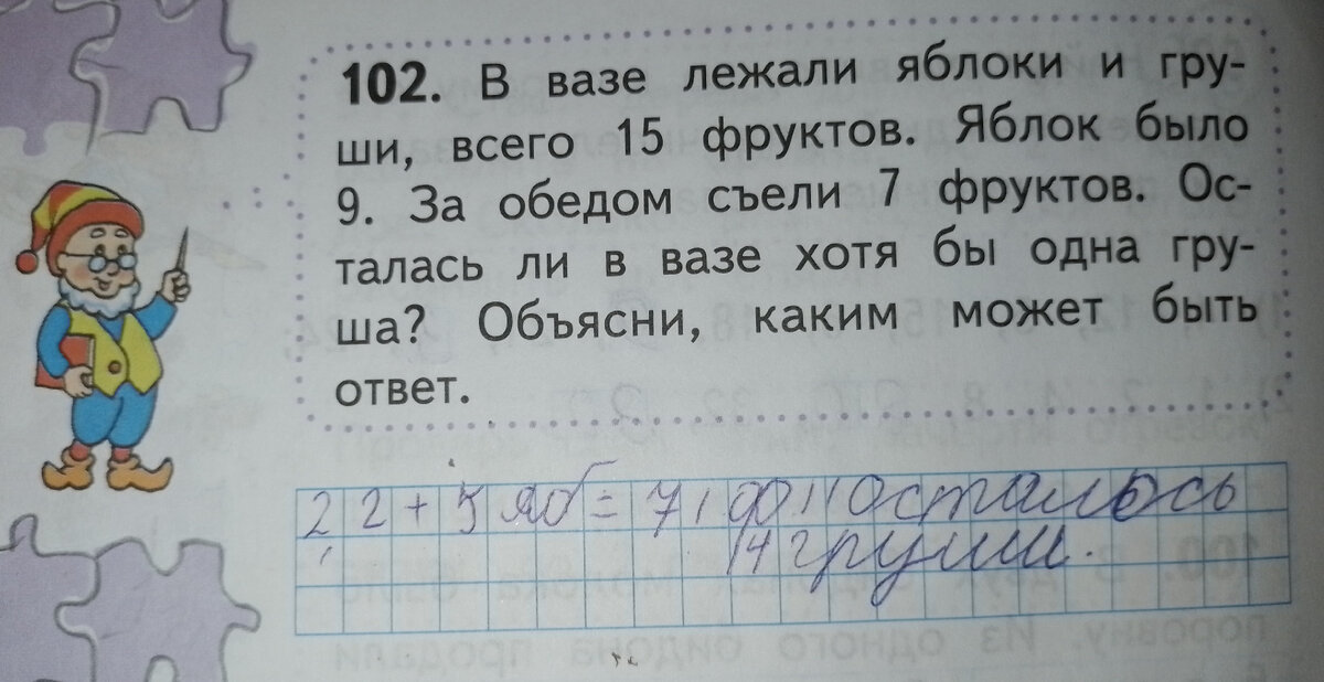 В вазе лежали яблоки и груши,всего 15 фруктов. Яблоки было 9. За обедом съели 7 фруктов. Осталось ли в вазе хотя бы одна груша?