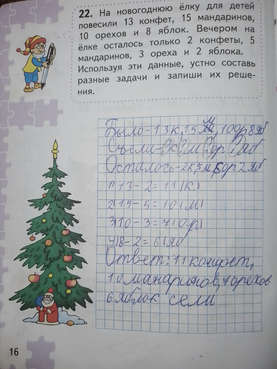 На новогоднюю ёлку для детей повесили 13 конфеты,15 мандаринов,10 орехов и 8 яблок. Вечером на ёлке осталось только 2 конфеты,5 ....