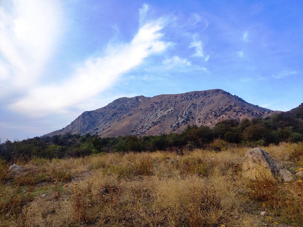Размяв ноги на Амирсое, мы были готовы к восхождению на Малый Чимган. Ну, это для меня с больными коленками - восхождение, а для обычного человека – просто прогулка по горам длиной в несколько километров, правда, с подъемом на 700 м. У меня были скачаны треки, и все нормальные люди ходят на Мал.Чимган с Песочного (или Песчаного) перевала. Нам же наш хозяин посоветовал идти прямо из поселка, типа там есть «тротуар»)), ну или тропинка в нашем переводе. Начали мы примерно из этой точки 41,560402, 70,019301 по дорожке или по коровьей тропинке, сказать сложно. Потом постепенно наверх образовалась четкая тропа, которая шла по хребту. На некоторой высоте обнаружили местную девушку, которая складывала камушки и увлеченно болтала по телефону. К счастью, периодически на склоне стояли деревца, в тени которых можно передохнуть: хоть 22 градуса и не так много, но подниматься было жарковато. Зато красиво: все время видно Чарвакское водохранилище и горы за ним. На определенном этапе вокруг образова