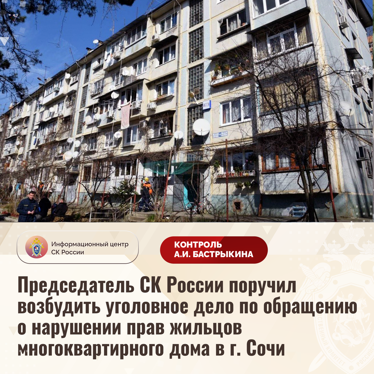 Председатель Следственного комитета Российской Федерации Александр Иванович Бастрыкин поручил руководителю СУ СК России по Краснодарскому краю Андрею Константиновичу Маслову возбудить уголовное дело и представить доклад об установленных в ходе первоначальных следственных действий обстоятельствах, по завершении расследования – о его результатах, а также о мерах к восстановлению жилищных прав граждан.