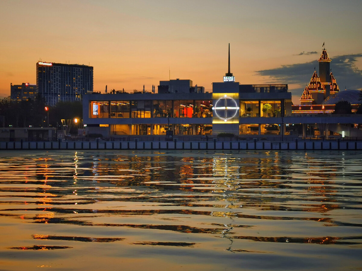 Южный Речной вокзал находится на правом берегу Москвы-реки, в Нагатинском затоне. Современное двухэтажное здание с высокими, широкими окнами и штилем было построено в 1985 году, первые пассажиры были приняты через год. Расположен Южный Речной вокзал на полуострове, который образовался вследствие спрямления русла Москва-реки еще в 60-е годы прошлого века. До постройки на этом полуострове так называемого "Диснейленда", полуостров представлял из себя природный парк из дикорастущих деревьев и кустарника. Вид на Южный речной вокзал из Нагатинской набережной во время заката.