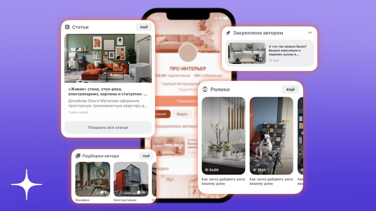 В последней версии приложения Дзена обновилась раскладка публикаций в каналах. Если раньше канал имел вид бесконечной ленты, где все форматы шли в хронологическом порядке, то теперь контент представлен в виде витрины. Карточки материалов сгруппированы по форматам, а очередность блоков «Статьи», «Видео», «Ролики» перестраивается динамически. Вверху страницы — блок с последней выпущенной публикацией. Например, если сегодня вы выпустили пост или статью, вверху будет блок «Статьи», а если до этого вы загружали видео, раздел «Видео» будет на втором месте. Ролики окажутся на последнем, третьем месте. Количество карточек в блоке зависит от платформы и размера экрана. Чтобы увидеть больше контента этого формата, нужно нажать кнопку «Еще» в правом верхнем углу раздела — перед вами откроется привычная лента. В этот же раздел с форматом также можно попасть из меню канала под шапкой профиля. Витринная раскладка позволяет быстро оценить наполнение канала, его тематику и представленность в разных фо