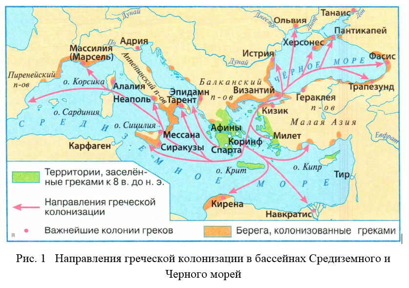Основные направления греческой колонизации, а вслед за этим и культурной экспансии в бассейнах Средиземного и Черного морей шли вдоль изначально налаживающихся торговых путей, что можно проследить по карте, представленной на рисунке 1.