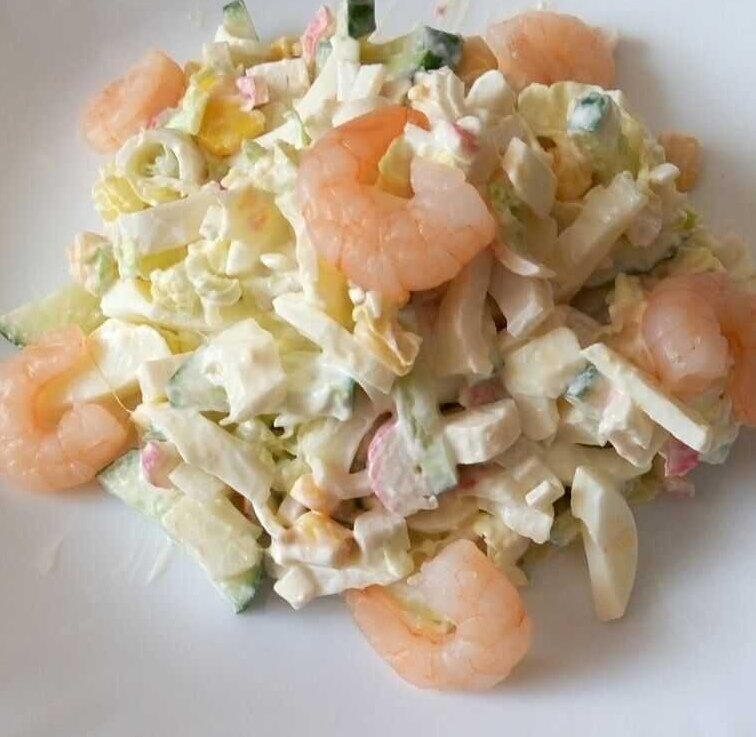 ✨✨✨🧚♀️✨✨✨ Вам понадобится : - пекинская капуста - креветки - крабовые палочки - огурцы - отварные яйца - соль по вкусу - майонез Приготовление : 1. Берём пекинскую капусту и мелко нарезаем, к ней добавляем креветки. 2. Затем добавьте крабовые палочки, огурцы и яйца нарезанные кубиком. 3. Соль по вкусу. 4. Заправляем салат майонезом. Приятного аппетита!!!