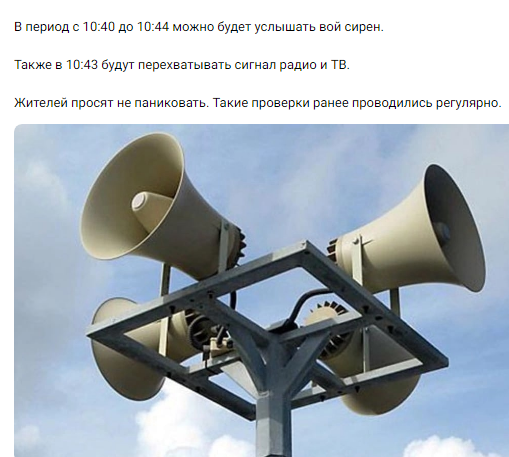 Вчера с утра была напугана воем сирен на нашей фабрике. Так как накануне была целый день на работе ,то не знала ,что это плановая проверка системы оповещения ,оказывается в местной группе предупреждали . И вот я стою у окна ,слушаю эту сирену и думаю ,ну и что делать ,куда бежать ,если вдруг чего ? Ну вы понимаете ... А никуда .Оказывается нужно включить телевизор и тебе там скажут ,что делать дальше.) Смешно ! И они нам говорят ,что молодёжь подсела на гаджеты ? А сами без телевидения ничего не могут . Странные люди ,не знают ,что первое ,что пострадает- это инфраструктура (электричество ,водоснабжение ,газ ). Свет у нас вообще от любого сильного ветра отключается ,не то что ... Или , например , сидишь с соседкой на лавочке и вдруг сирена ,говоришь ей : -Пойду посмотрю телевизор ,чего -то хотят сказать , -и топаешь на свой второй или пятый этаж . Допустим ,успела дойти ,а они тебе говорят : -Без паники ,берите документы и спускайтесь вниз!- и ты назад по лестнице... а куда ? Помню в