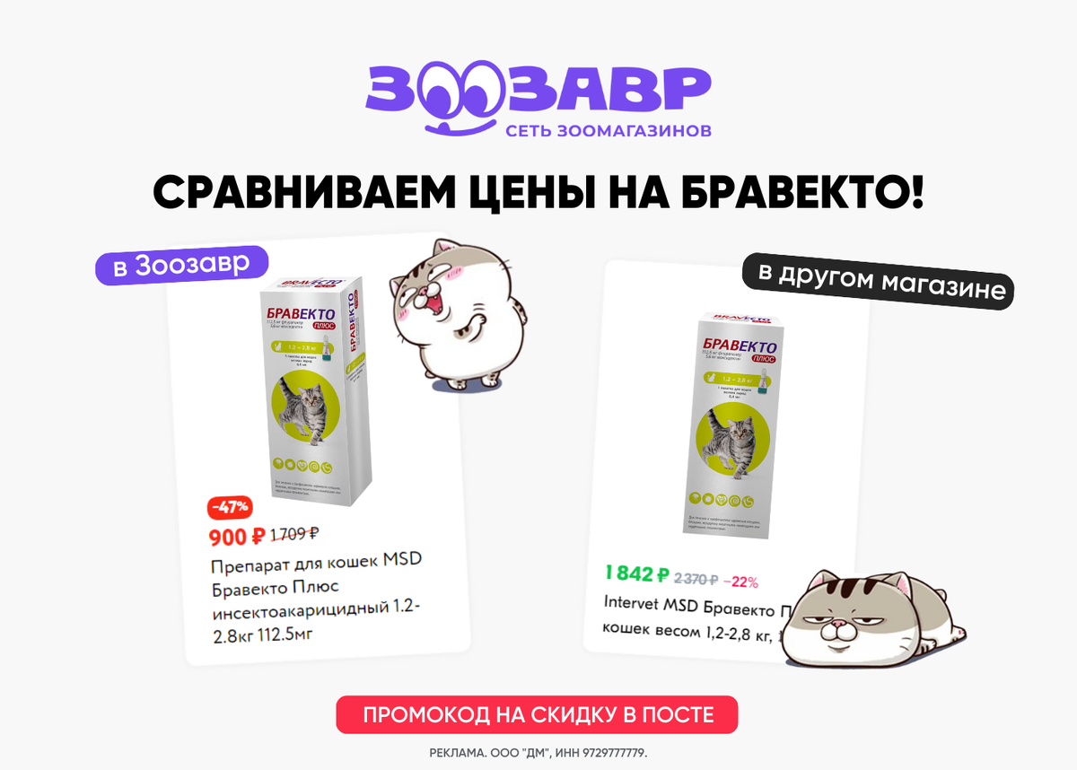 Препарат для кошек MSD Бравекто Плюс инсектоакарицидный 1.2-2.8кг 112.5мг — в других магазинах цена начинается от 1500 рублей 👎, а в Зоозавре Бравекто можно купить со скидкой в 47% всего за 900 рублей, а с учетом промокода будет ЕЩЕ ВЫГОДНЕЙ!