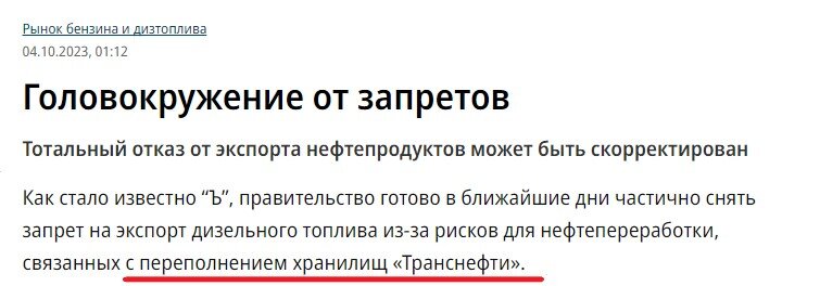 И выяснилась интересная деталь. Как оказалось, из-за запрета на экспорт, топливо становится просто негде хранить, поскольку компании не обеспечены таким количеством необходимых емкостей. И если этот запрет будет действовать дальше, это приведет не к снижению цен, а к сокращению производства.