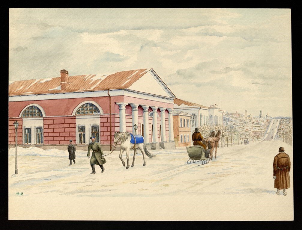 «Здание манежа (театра)» было выстроено в 1820 г. в качестве манежа для учения полковых лошадей, по проекту архитектора Карла Ивановича Гофмана. Центральный фасад сооружения был изначально декорирован в стиле ампир: фронтоном и колоннами.