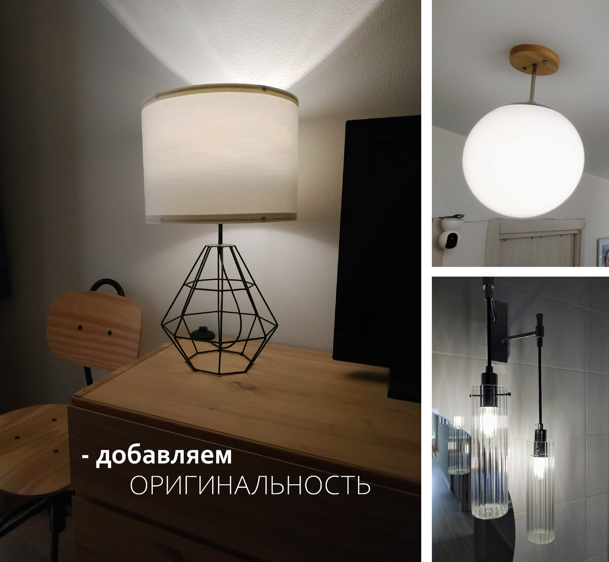 В интерьере квартиры я отдаю предпочтение натуральным материалам, таким как стекло, металл и массив дерева, и часто использую их в сочетании друг с другом. В этом светильнике мне потребовалось заменить потолочную чашку и немного подрезать ножку. Приобретенный светильник имел неестественно выпуклую металлическую чашку, поэтому супруг заменил ее на плоскую деревянную. Получились оригинальные светильники для коридора. Над кухонным столом мне потребовался вертикальный подвесной светильник. У приобретенного светильника отсутствовали плафоны. В качестве узких цилиндрических плафонов и для визуального усиления вертикальности с помощью полос, отлично подошли... вазочки. Для крепления плафонов к светильнику, необходимо было просверлить отверстия в трёх патронах. В вазочках отверстия уже имелись, открутить ручки не составило труда. Оставалось только прикрутить вазочки-плафоны на подходящие винты к патронам светильника и светильник готов. По тому же геометрическому принципу - вертикаль к круглому