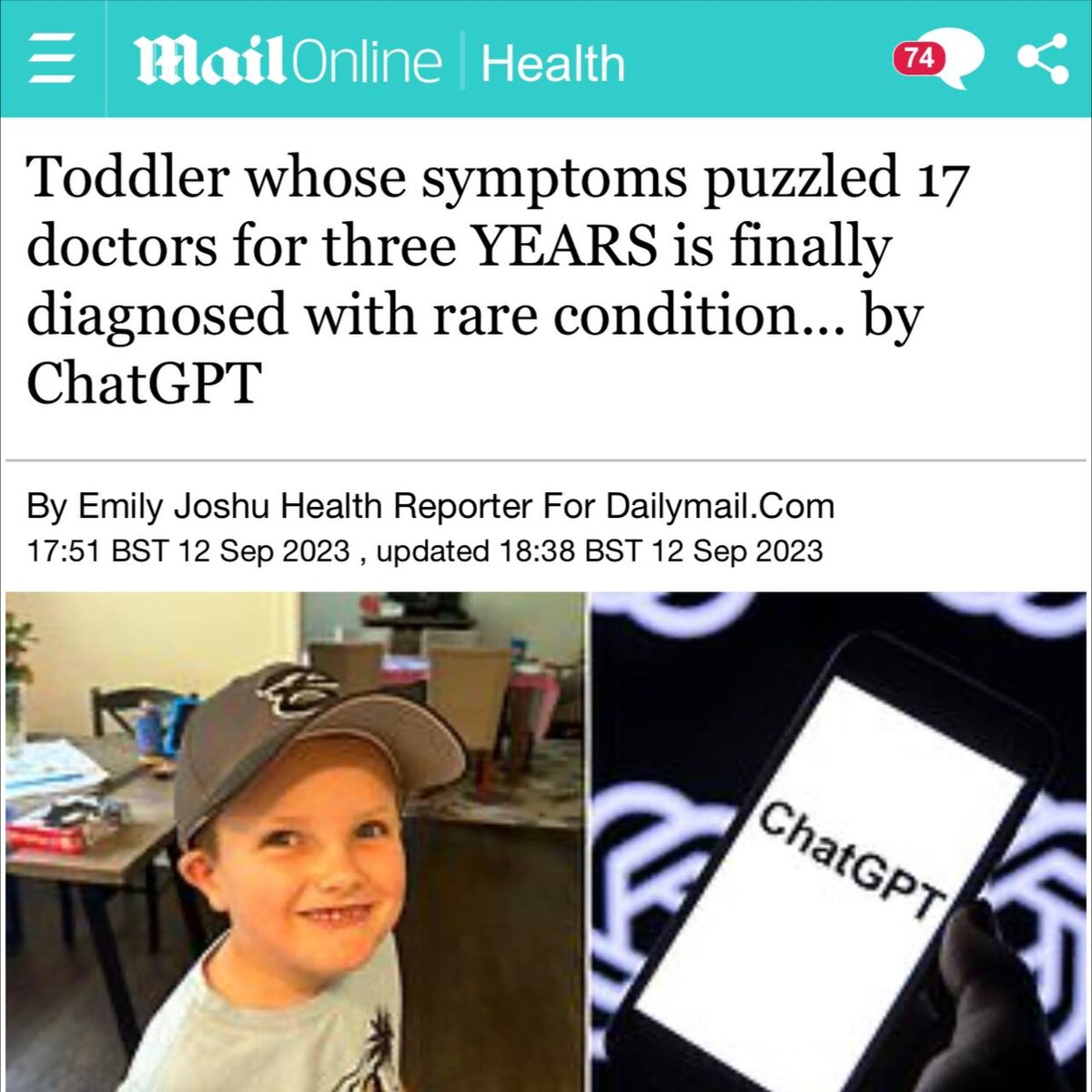 17 специалистов осматривали мальчика и разводили руками. В отчаянии мать обратилась к ChatGPT. Чат-бот на основе симптомов определил редкий диагноз - расщепление позвоночника и порок развития спинного мозга. Вывод ИИ был верным, мальчику сделали операцию и он выздоровел.