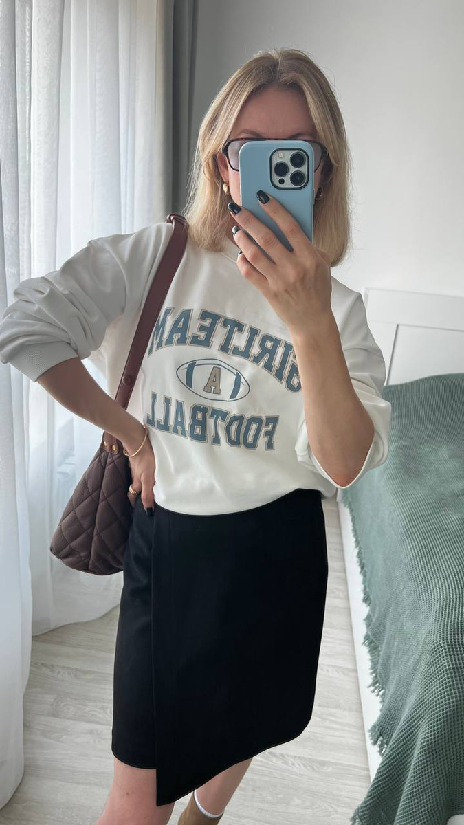 Во-первых, оптимальная длина и размер. Юбка не должна сидеть впритык и еле-еле прикрывать попу. В 2023 году правит комфорт, одежду выбираем такую, чтобы было приятно провести в ней весь день, а не мучаться от дискомфорта.