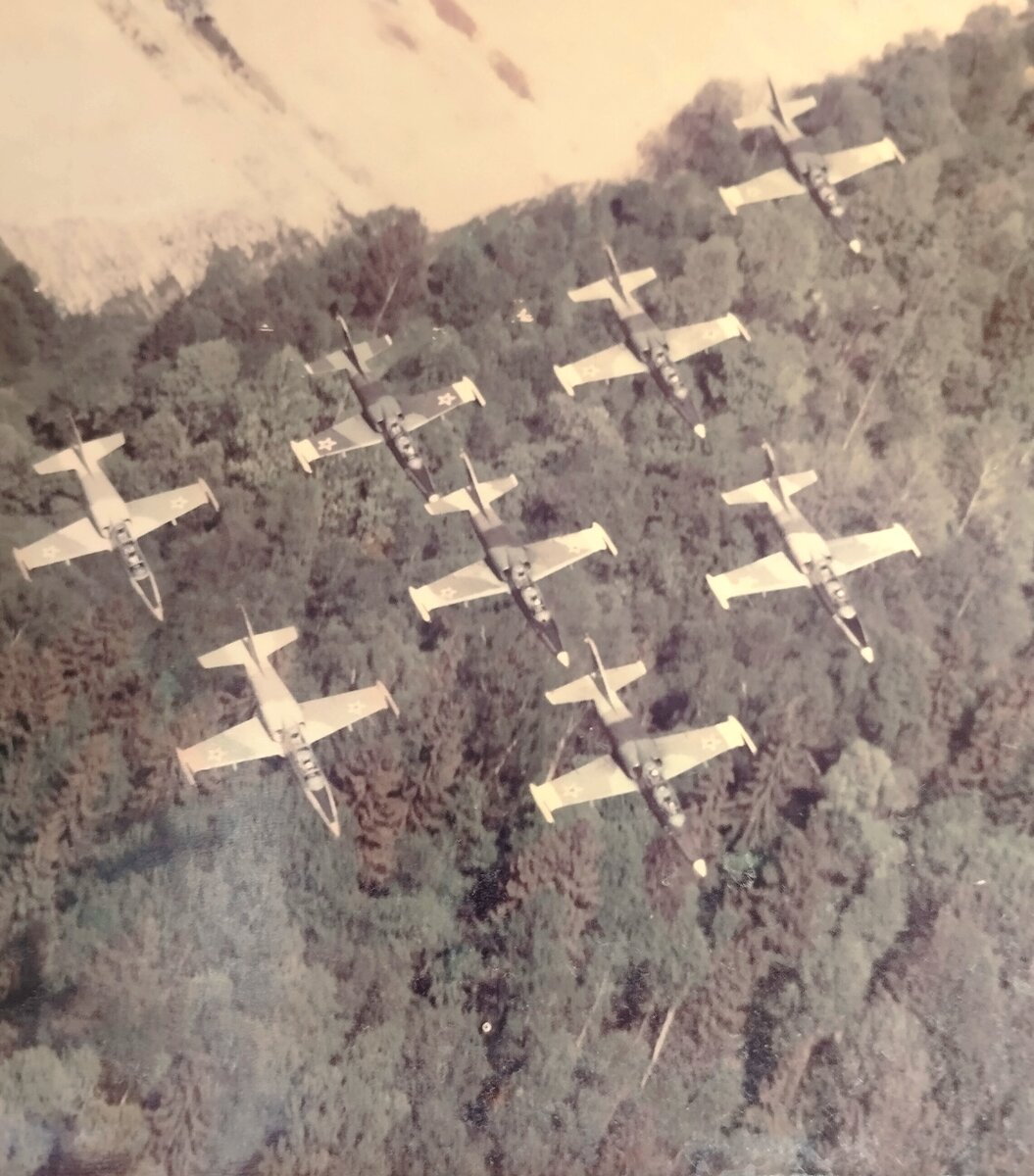 В 1987 году, в СССР была официально создана первая пилотажная группа. Все что было до этого обычно было или за штатом или имело другой статус. В составе Вяземского УАЦ ДОСААФ была создана пилотажная группа Русь. Уже на первый показ этой группы в Москве, в день авиации 1987 года над Тушино, был установлен рекорд по количеству зрителей, которые пришли на поле Тушинского аэродрома. Тогда пришло более 800000 тысяч человек! В то время, на одну из тренировок Руси, попал выдающийся отечественный фотограф Сергей Скрынников. Одно из его фото с тренировки, когда с девятого самолёта , снимали остальные. Тот самый первый состав. Красота в кадре! Кстати кадр до сих пор висит на стене в высотном домике пилотажной группы., как память о мастере!