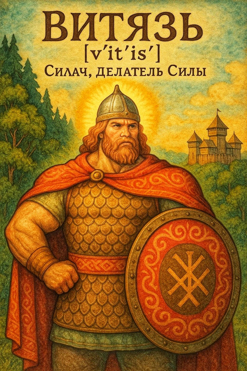 Происхождение слова Витязь. Транскрипция: [в'и́т'ис']. Вероятно происхождение с мокшанского от Вий -Сила и Тиись -Делатель или Делающий, т.е. Витязь -Вий Тиись -Силу Делающий или Делатель Силы. В итоге получается наилучший перевод по смыслу слова Витязь - это Силач.