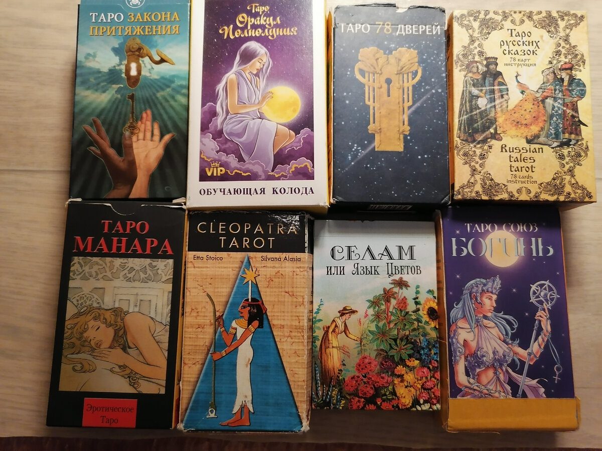 Мне тяжело работать только с одной колодой - я устаю. У каждого таролога - свои привычки. Кто-то пользуется только одной колодой, и это тоже правильно, это его дело. Но меня это не устраивает. Поэтому у меня несколько колод. Кому интересно - можете посмотреть))) Есть также и классическая колода, с которой я начинала - как и все, но она здесь не представлена. При этом я не могу сказать, какой колоде я отдаю предпочтение. Есть только ещё плохо изученные мной колоды - например, большая колода Ленорман, где 54 карты (она сложная), и ТАРО НА ЛАДОНИ - тоже колода, с которой надо хорошо разобраться. Но будем разбираться вместе))) В будущем я постараюсь выкладывать расклады на этих колодах. Мне очень нравятся пасьянсы. Они не так популярны, но лично у меня вызывают интерес)))