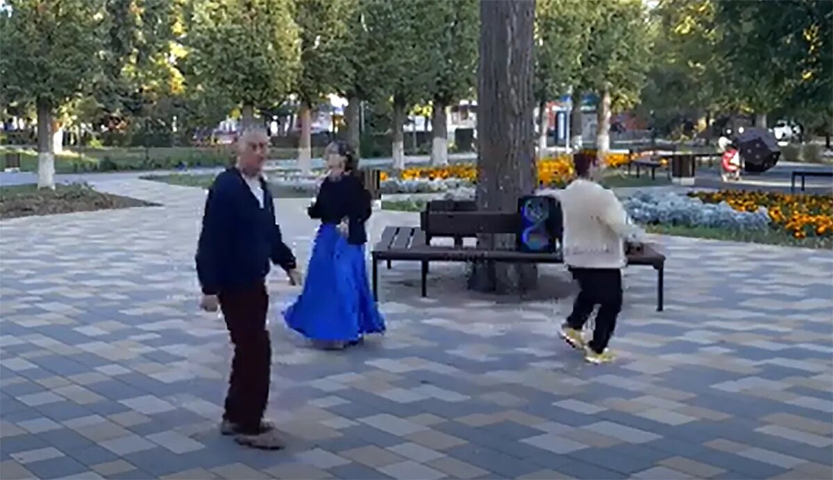 Между тем, детей на площадке становилось все меньше и меньше, а сейчас и вовсе никого не осталось. На смену им пришло несколько энергичных старушек, которые устраивают здесь «странные танцы» перед восходом луны или среди белого дня. И Шкиль с женой вместе с ними отплясывает. В приоритете русские народные песни. Ну чем не ток-шоу?